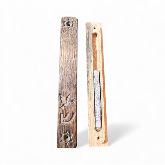 Drewniana rzeźbiona mezuza zabezpieczona eleganckim tekturowym etui, wewnątrz zawiera papierowe błogosławieństwo.